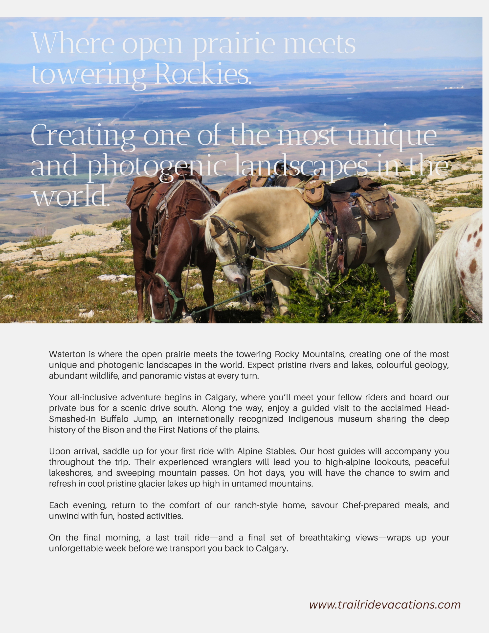 On the final morning, a last trail ride—and a final set of breathtaking views—wraps up your unforgettable week before we transport you back to Calgary.