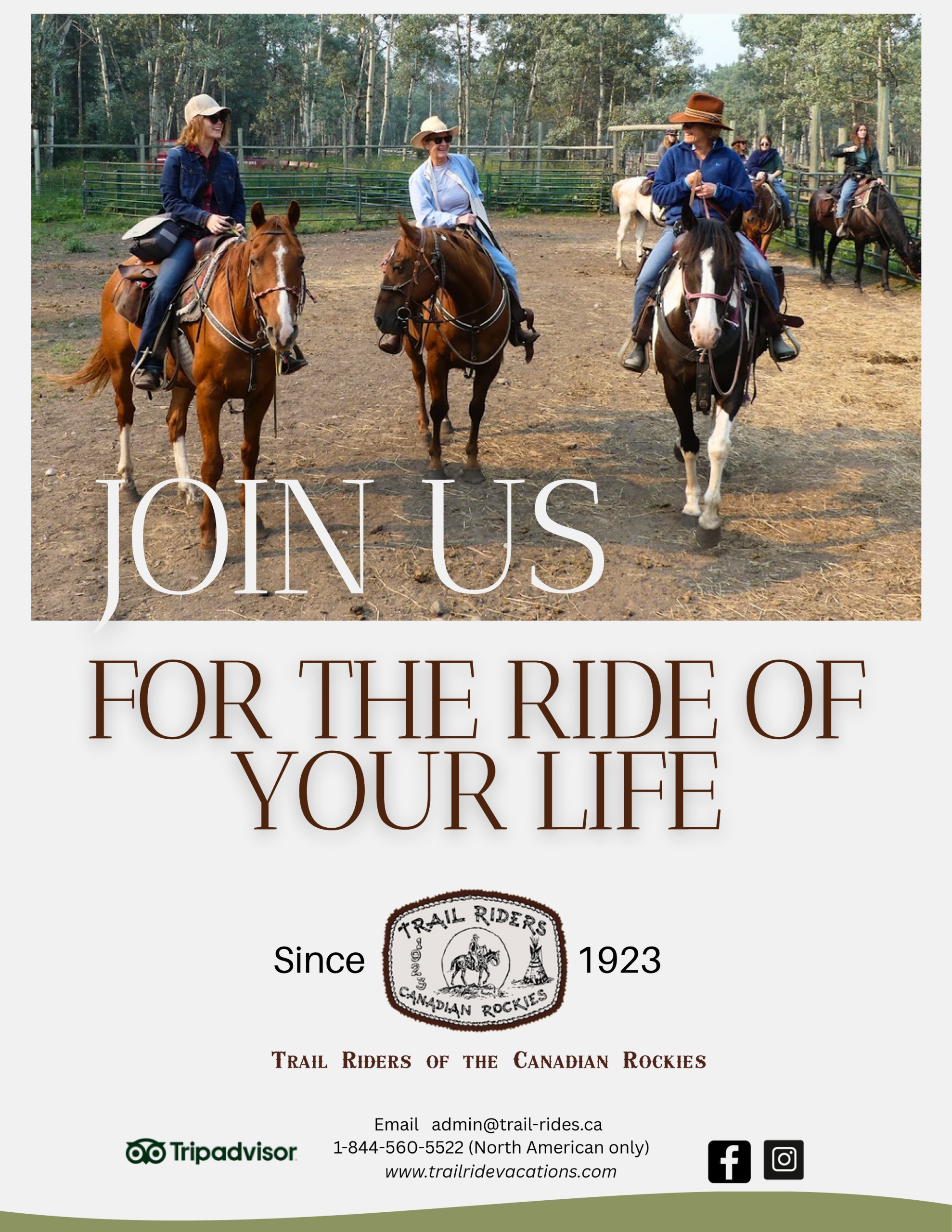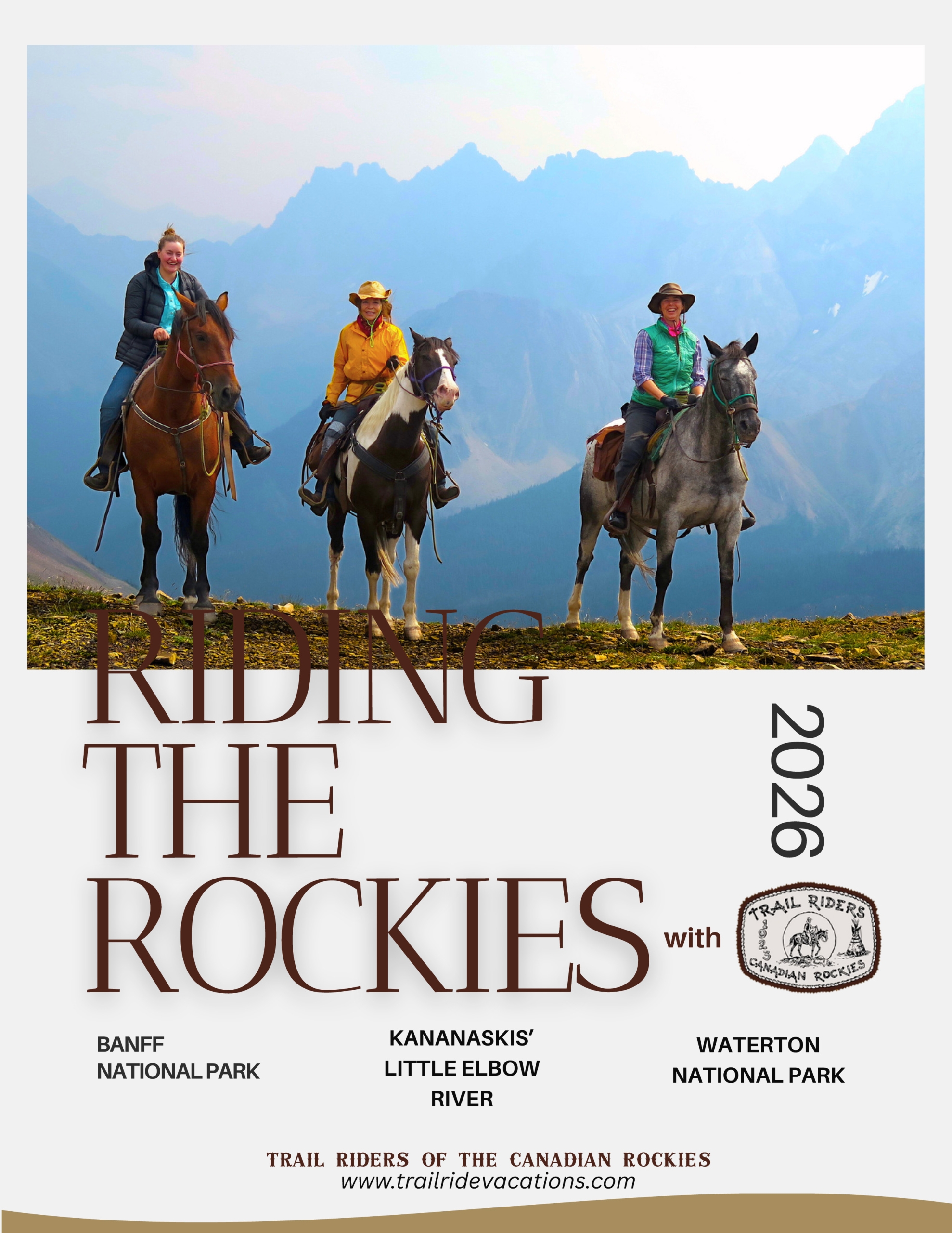 In 2026, the Trail Riders of the Canadian Rockies (TRCR) will ride in Waterton Lakes National Park, Banff National Park and trails at Little Elbow River in Kananaskis, all in Alberta, Canada.